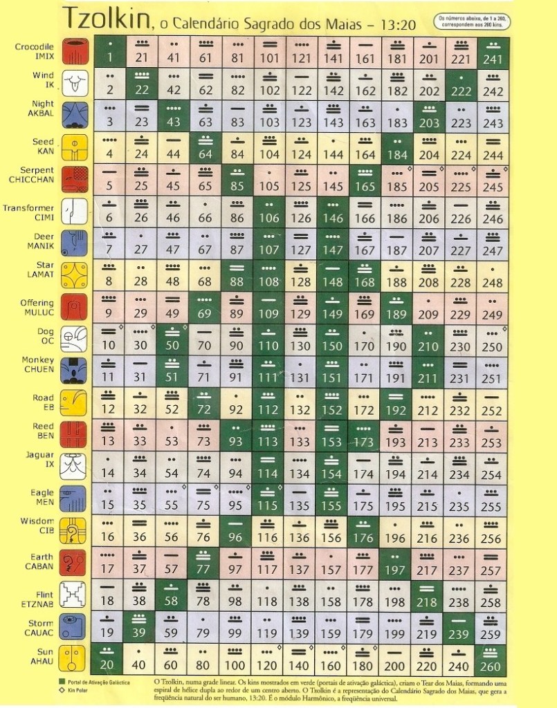 This is a mystical “diagram”. For the extensive and dedicated work of many who have sustained this diagram and been able to expand on its significance, we offer many thanks. The squares which are colored green have been designated by some schools of thought as Galactic Activation Portal Days. We are best served by tuning into the messages specific to our own inner knowing and resonance. It is through this inner reflection and “asking”, that you are able to identify whether or not your own guidance is indicating a synchronicity between your journey and the particular tones and K’ins of this Tzolkin Day keeping system.